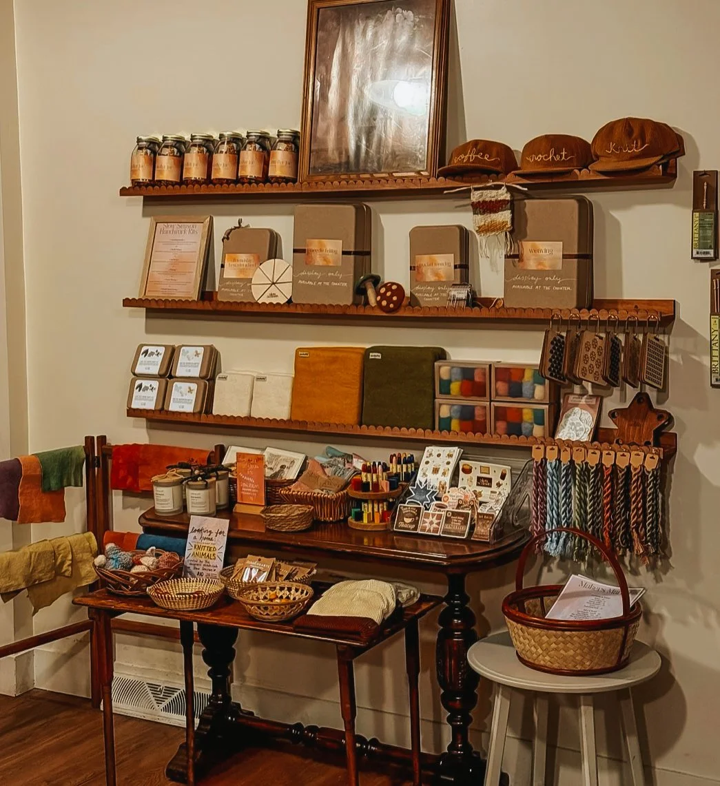 In the Coffee House you’ll find a cozy corner full of beautiful handwork supplies. Wool, yarn (coming soon), notions, tools, hand stitched hats, and some tiny treasures!