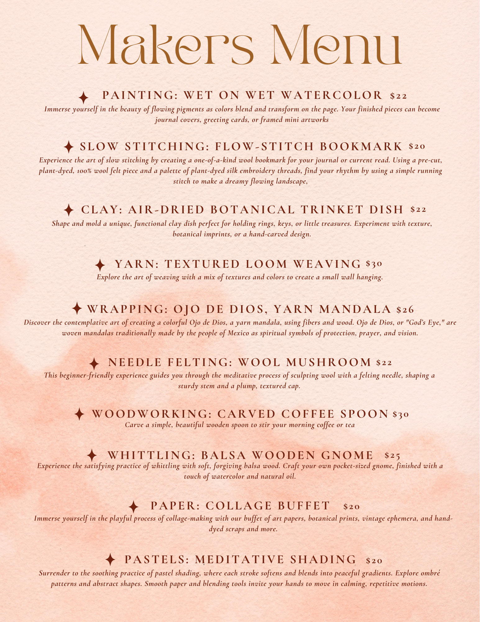 Choose Your Craft – Browse our Maker’s Menu to find a project that speaks to you. Each one comes with high-quality materials and everything you need to get started.